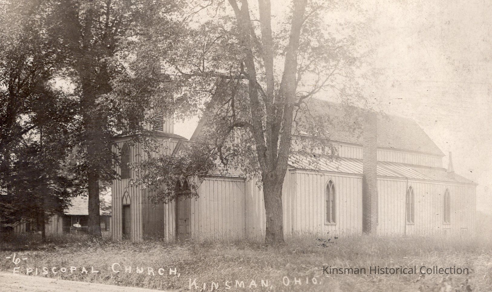 Exterior of the Episcopal Church in Kinsman, Ohio obstructed by trees.Cataloged By