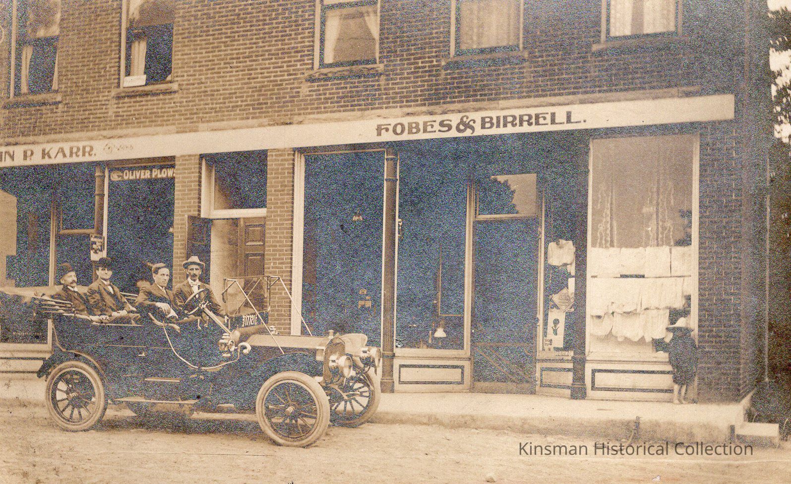 Group of men sitting in an automobile in front of the Fobes & Birrell storefront.Collection