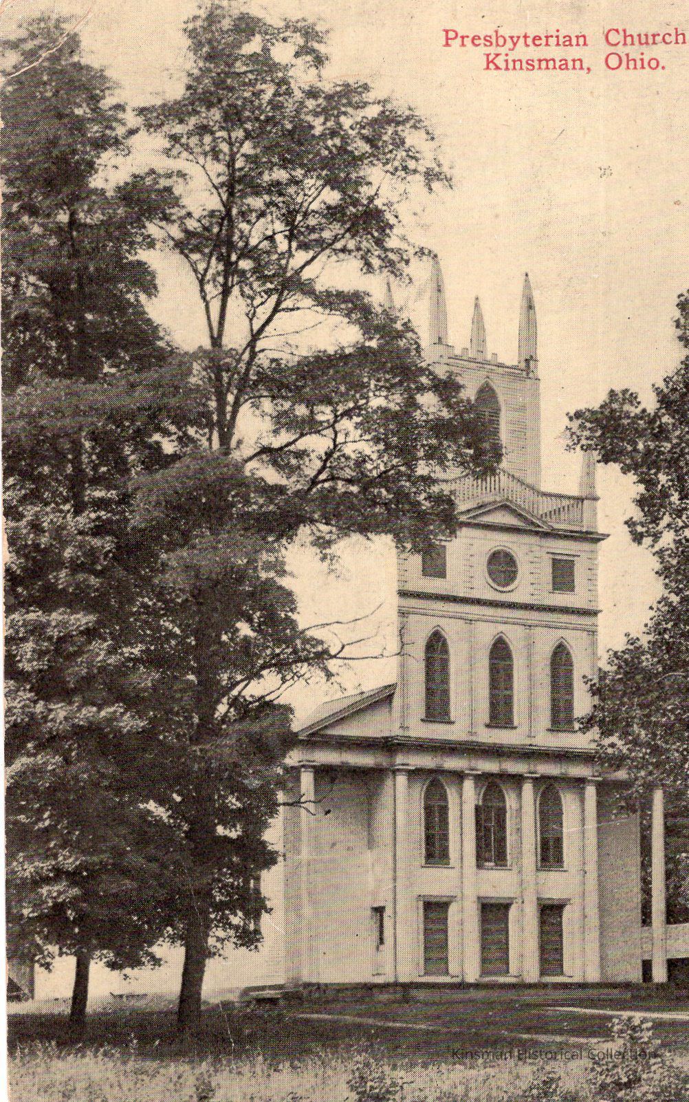 "Presbyterian Church, Kinsman, Ohio". Written postcard on the back dated August 1921.Collection