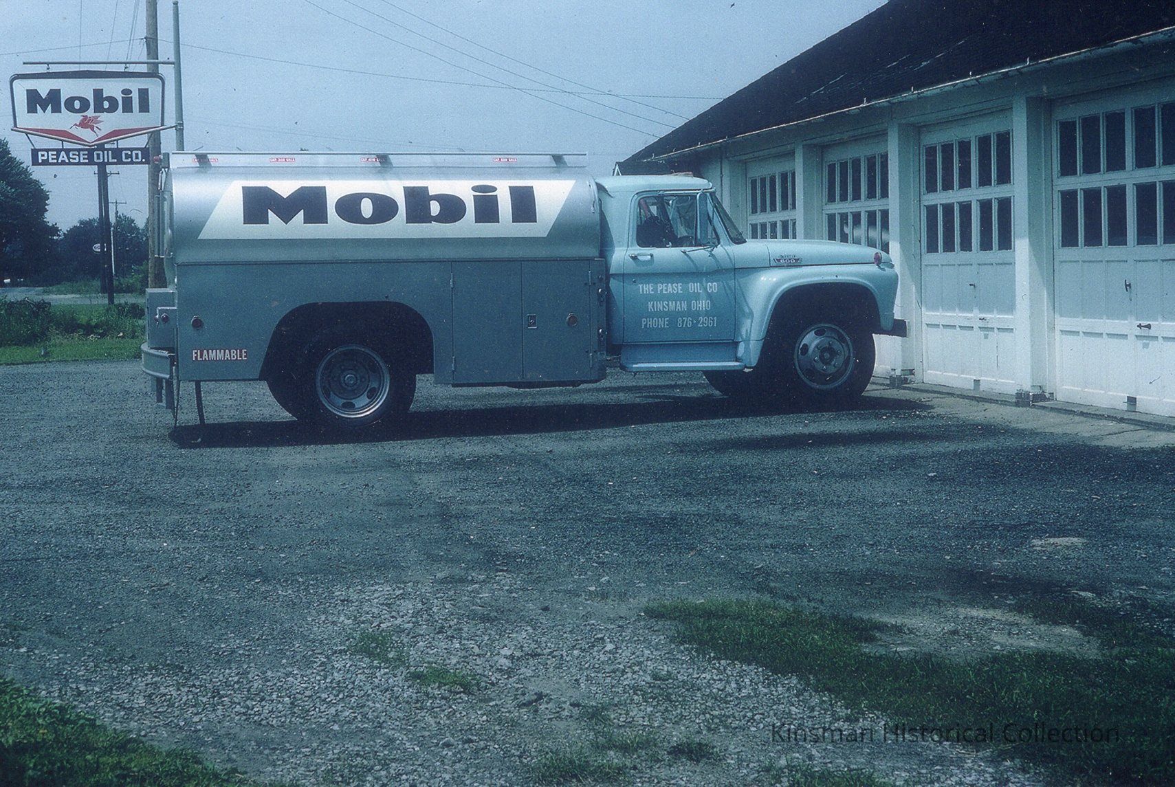 Mobil Pease Oil Company delivery truck parked in front of garage. Started as a partnership, the Pease-Hanson Company (Melbourne Pease and Penny Hanson), it became Pease Oil Company after Mr. Hanson's death. Ownership passed to Gordon Pease Sr. and with his passing, the company stayed in the family with Gordon Jr. and his sister sharing ownership until 1984 when it was sold to Ainsley Oil Company. The Pease Oil Company was honored by Mobil Oil Company at one point for 50 years of service.Cataloged By