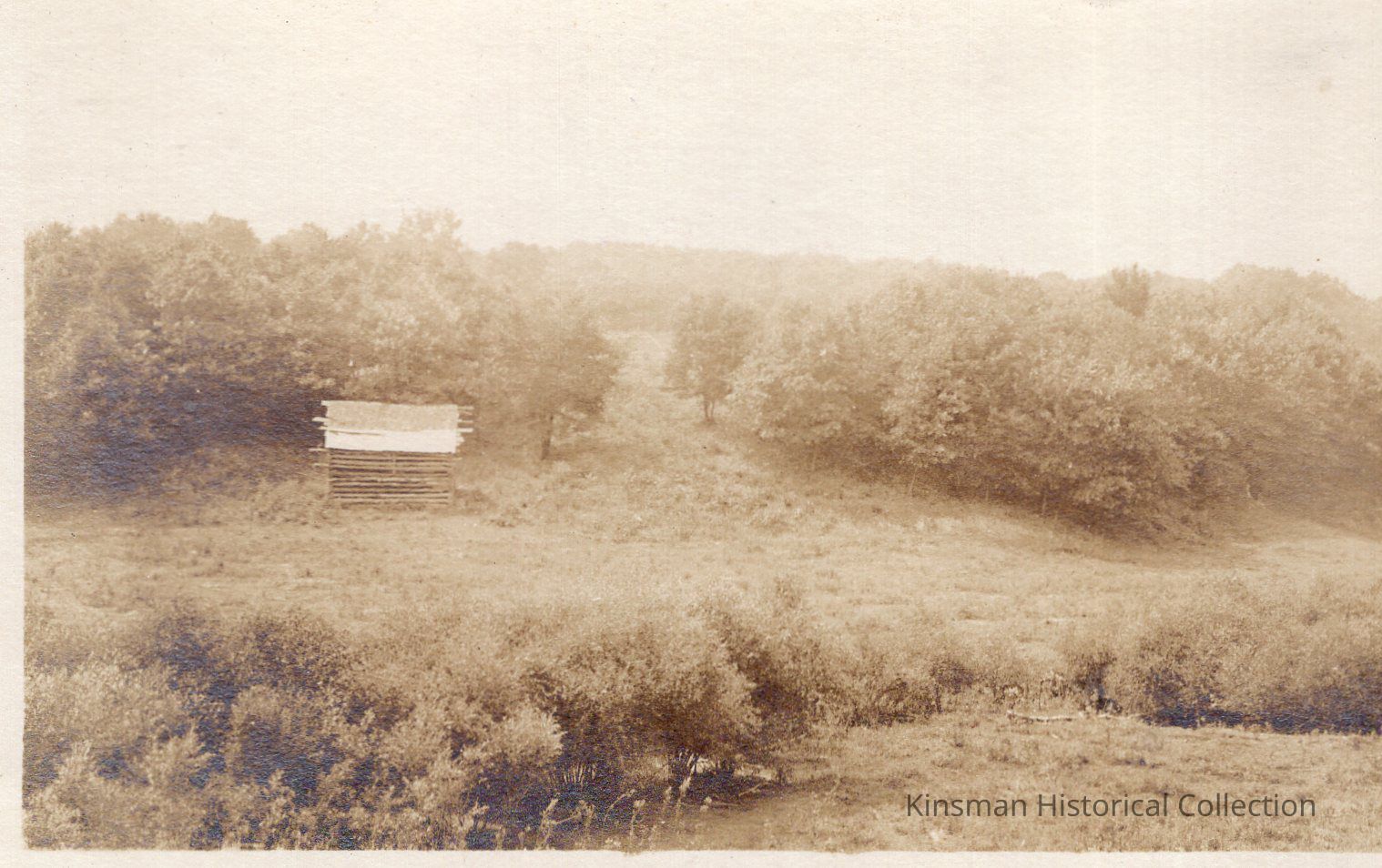 Shack in field surrounded by forest.Cataloged By