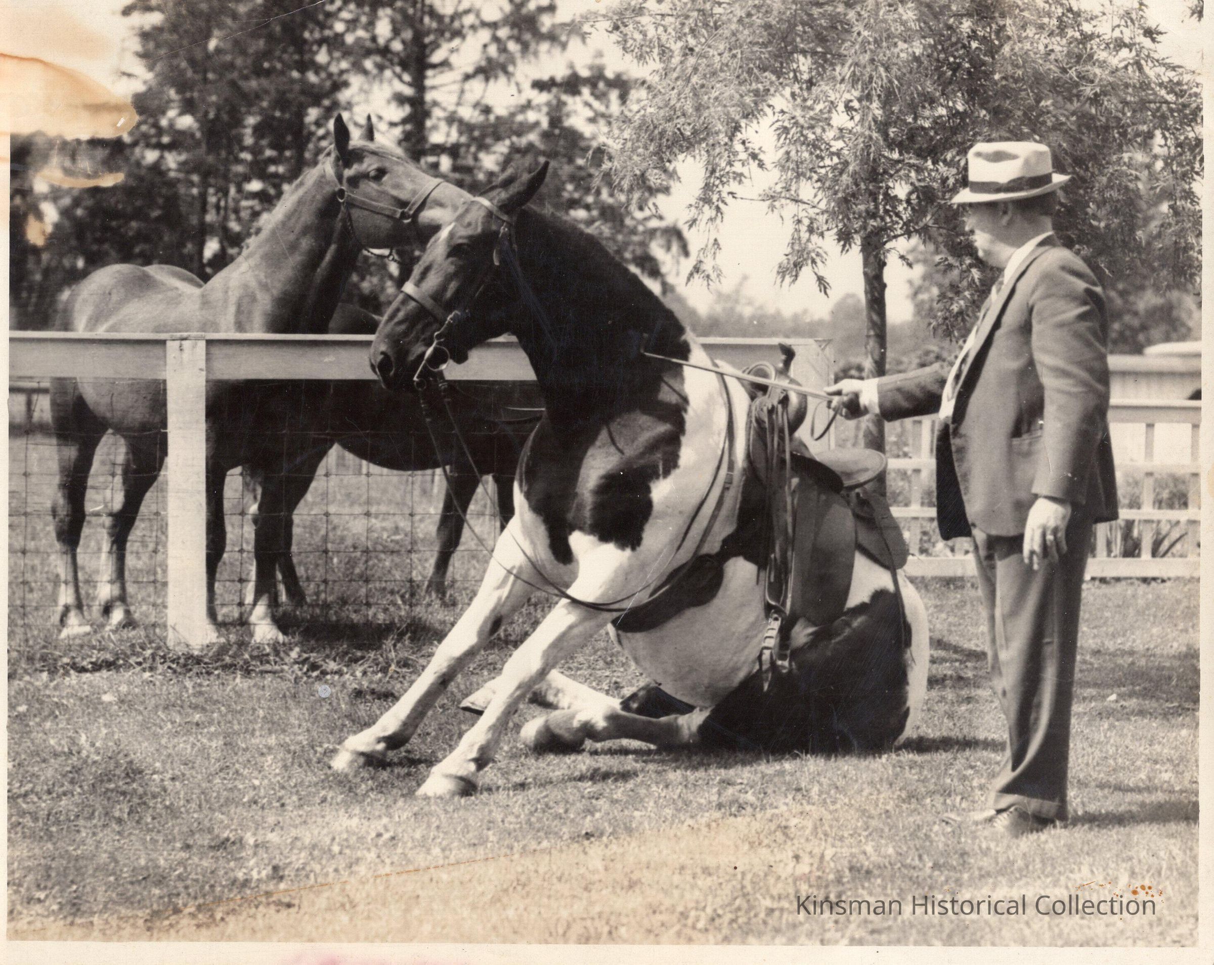 Man training a horse identified as Lee (Penny) Hanson in the late 1940s.Cataloged By