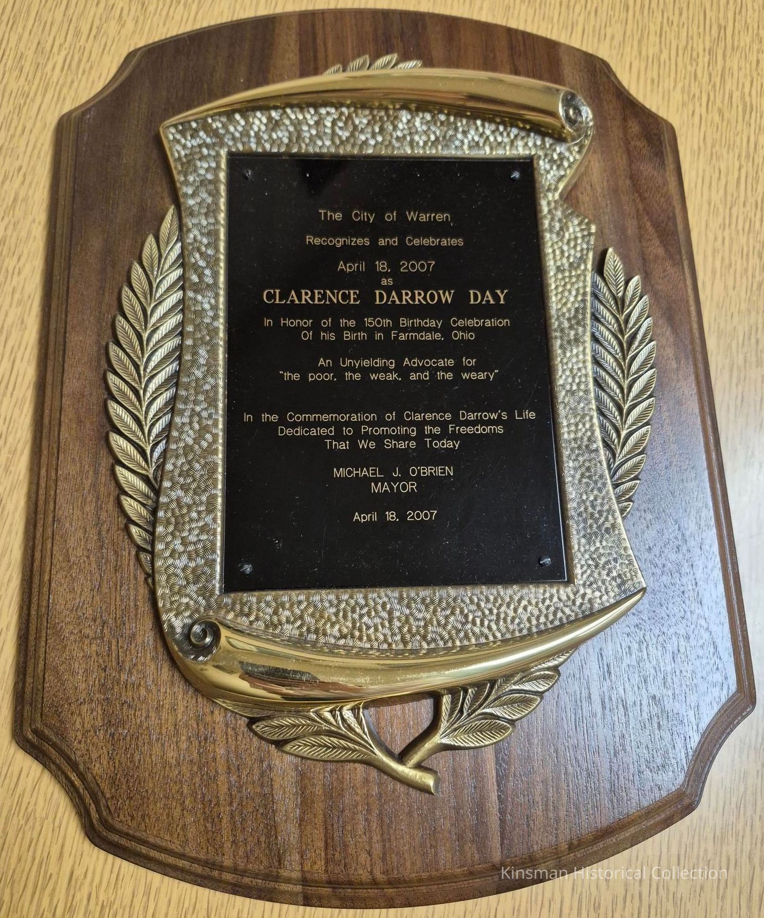 Mounted plaque "The City of Warren Recognizes and Celebrates April 18, 2007 as Clarence Darrow Day In Honor of the 150th Birthday Celebration of his Birth in Farmdale, Ohio. An Unyielding Advocate for 'the poor, the weak, and the weary'. In the Commemoration of Clarence Darrow's Life Dediated to Promoting the Freedoms That We Share Today. Michael J. O'Brien Mayor April 18, 2007."Cataloged By