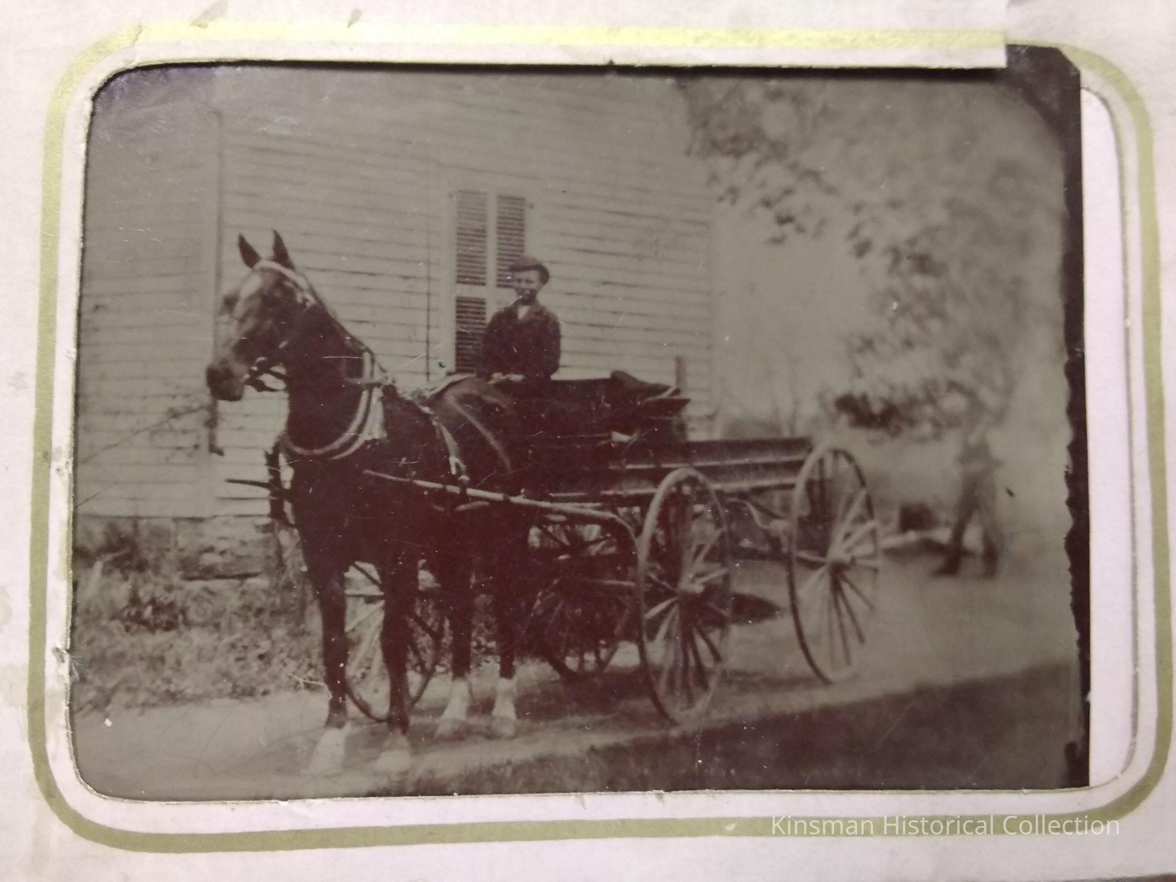 Tintype of Bert Hurlbert sitting in a horse drawn carriage. Son of Sarah Jane (Kitch) Hurlbert and Homer Hurlbert, brother to Howard and Nellie.Collection