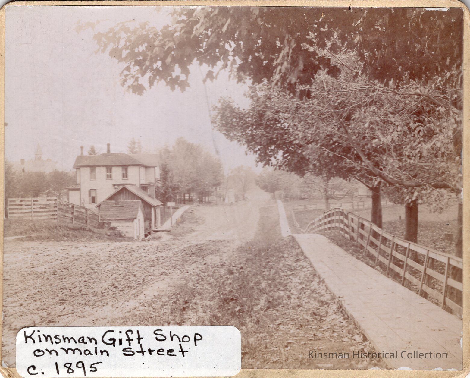 Roadway with fence lined path looking north on Main Street from the square. Building in distance identified as Pharmacy on Main Street circa 1895 later replaced by the Kinsman Gift Shop.Cataloged By