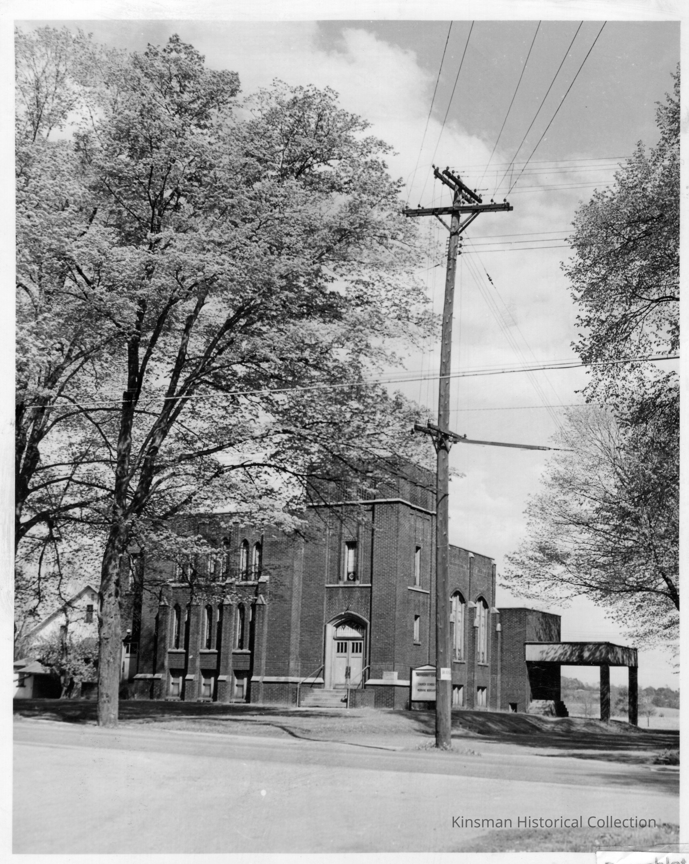 Kinsman Methodist Church exterior from across the road surrounded by trees. Thought to be same as (2022.1.136) but with the power lines.Cataloged By