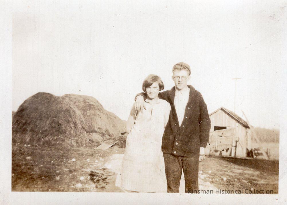 Couple on a farm with barn and haystack.Collection
