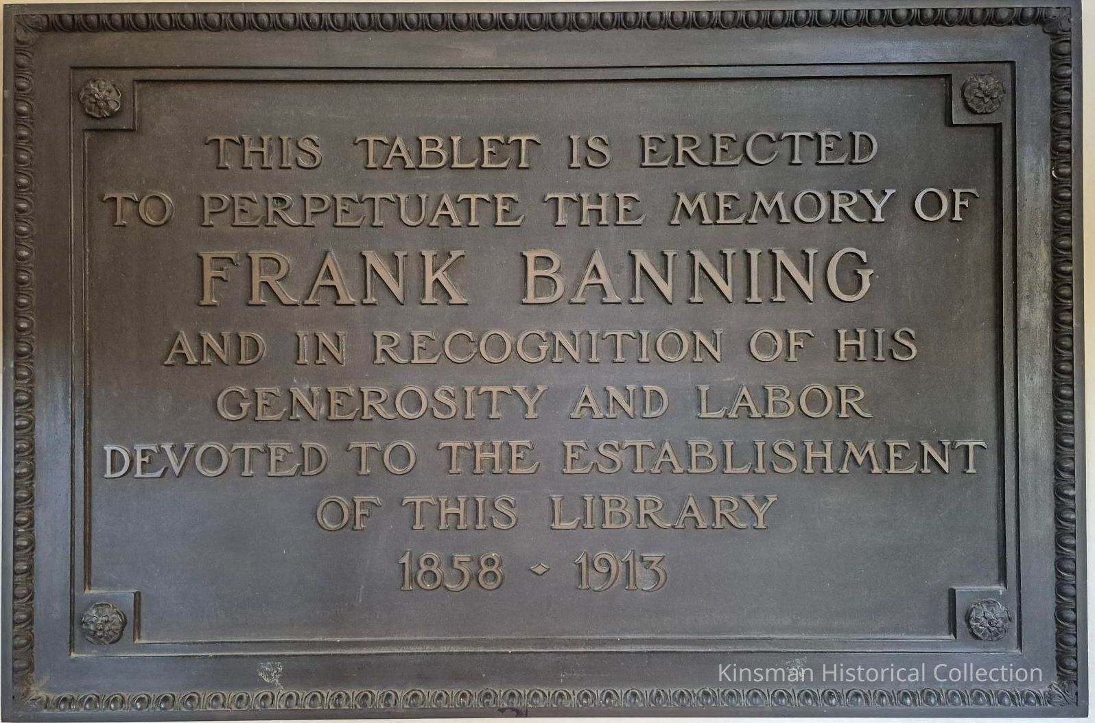 Bronze plaque "This tablet is erected to perpetuate the memory of Frank Banning and in recognition of his generosity and labor devoted to the establishment of this library 1858-1913".Cataloged By