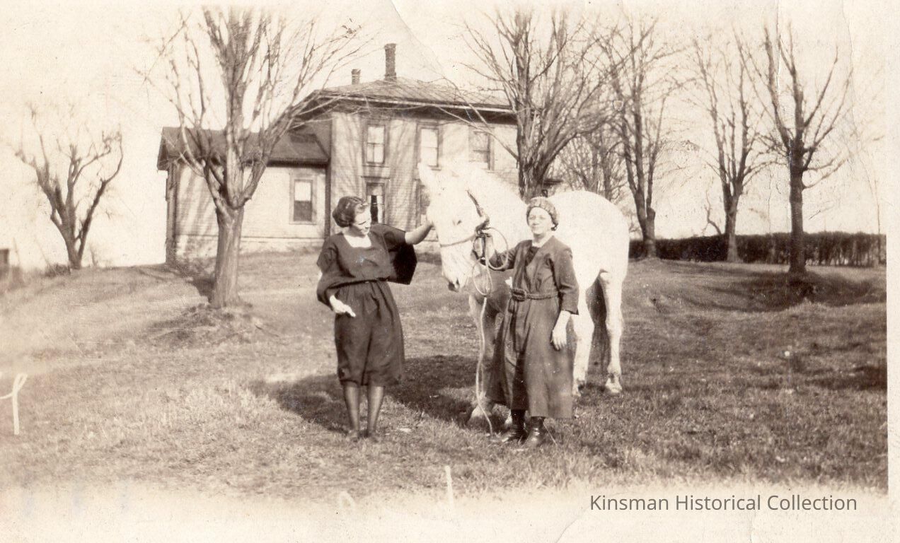 Two women standing with a horse.Collection
