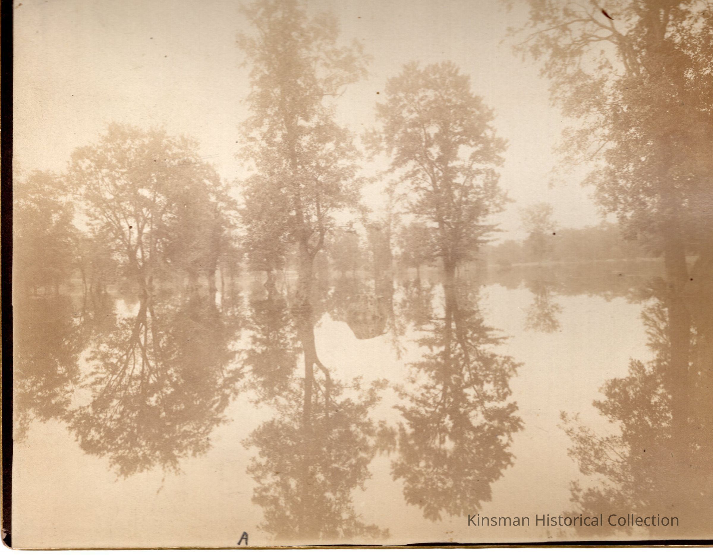 Reflection of trees in high water at Pymatuning Creek (from the east end of the iron bridge, west of mule pen crossing R.R. to the left and R.R. bridge directly above).Cataloged By