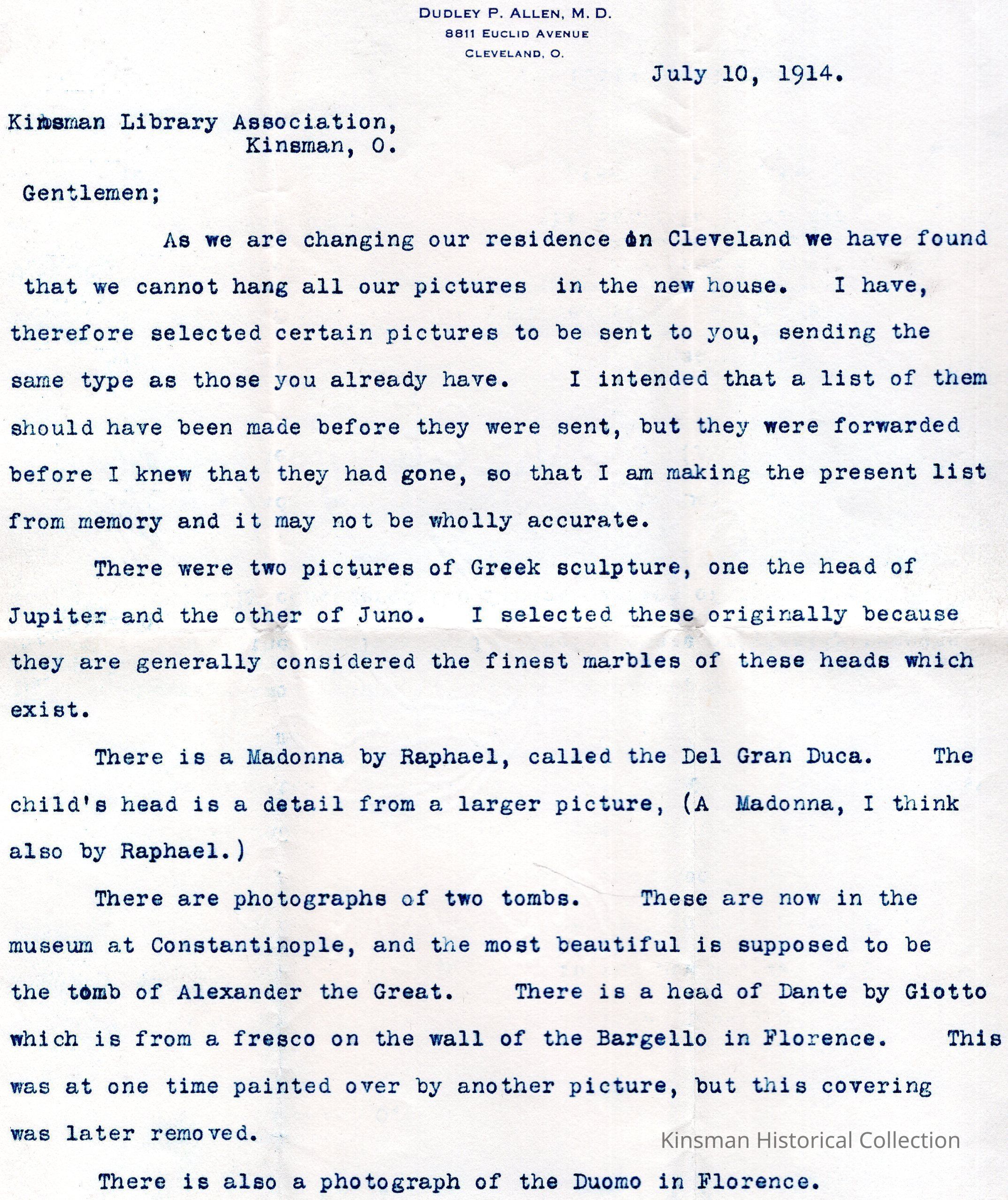 Letter written from Dudley P. Allen to Kinsman Library Association from July 10, 1914. Allen is offering a donation of selected pictures form his collection to furnish the library.