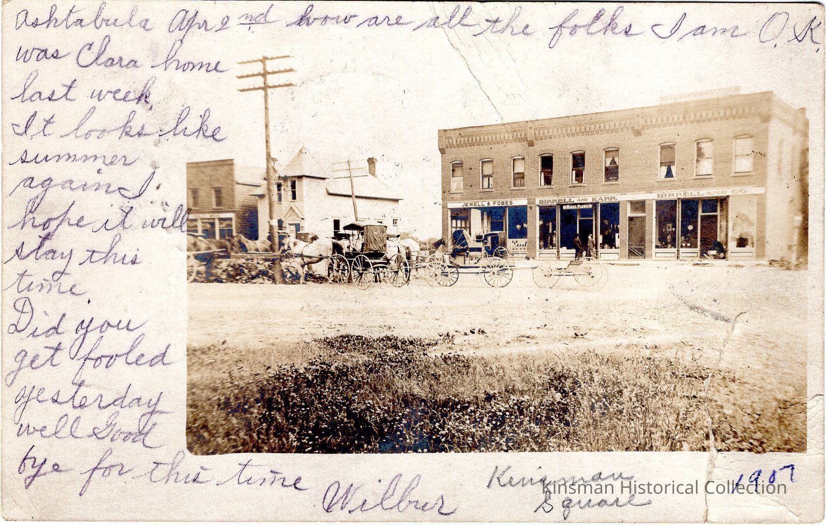 Kinsman Square in 1907 with many parked horses and businesses in the background including Jewell & Fobes, Birrell and Karr, and Birrell and Co.Collection