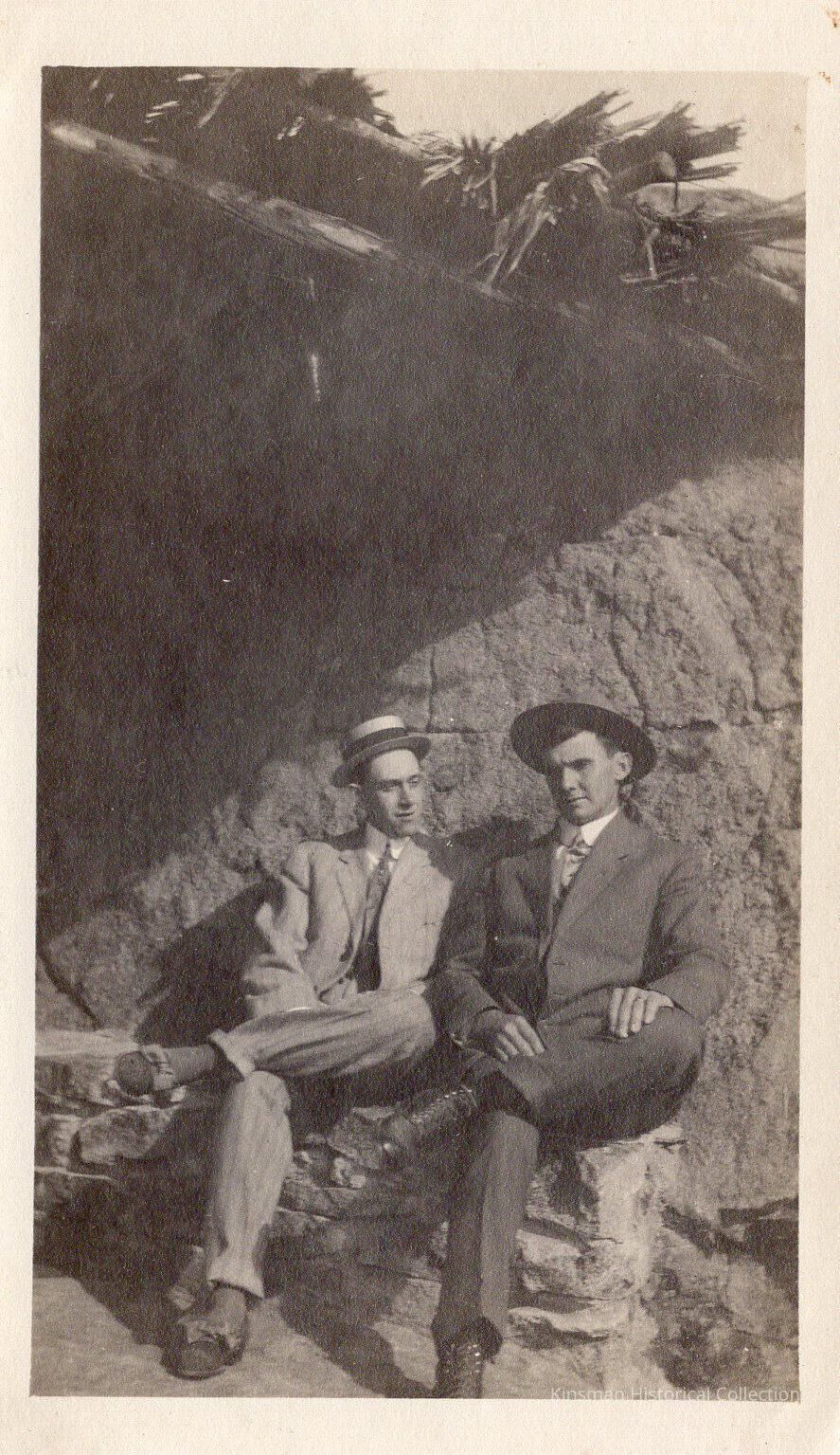 Two men sitting on a rough stone bench by an outdoor structure.Collection