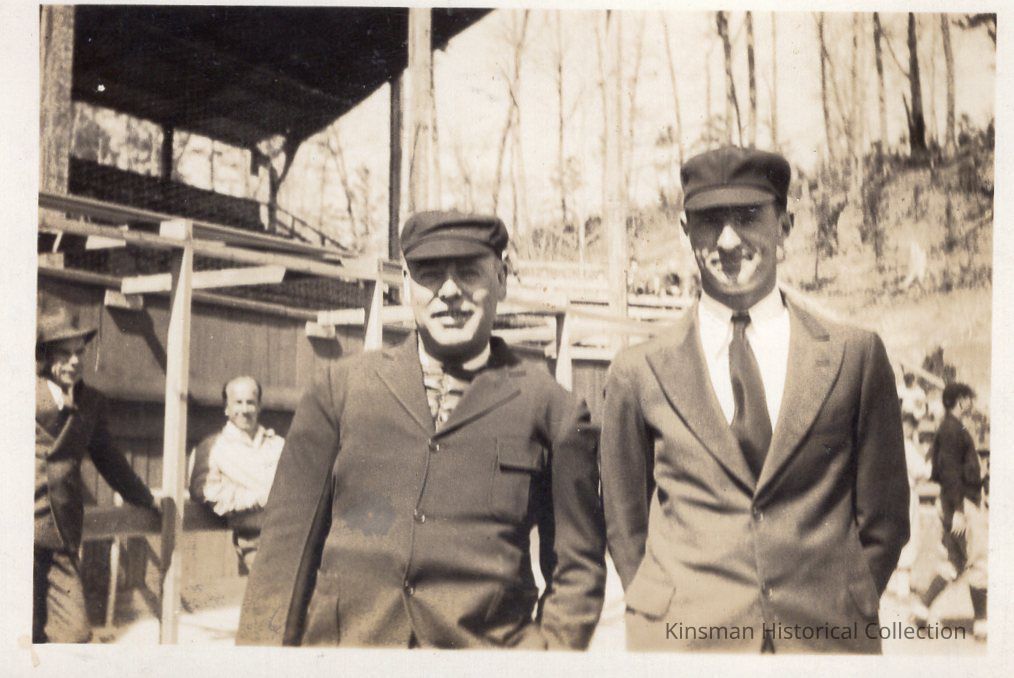 Bill McKinley with another man standing in front of bleachers taken on April, 9 1939.Cataloged By