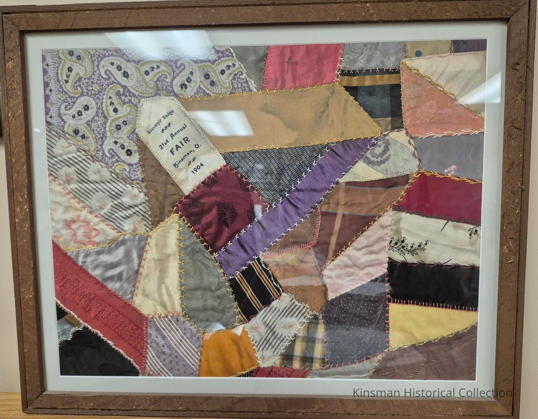 Patchwork pillowcase including a Souvenir Badge from the 21st Annual Fair Kinsman, O. 1904. Created by Helen Fenn in the crazy quilt style.Cataloged By