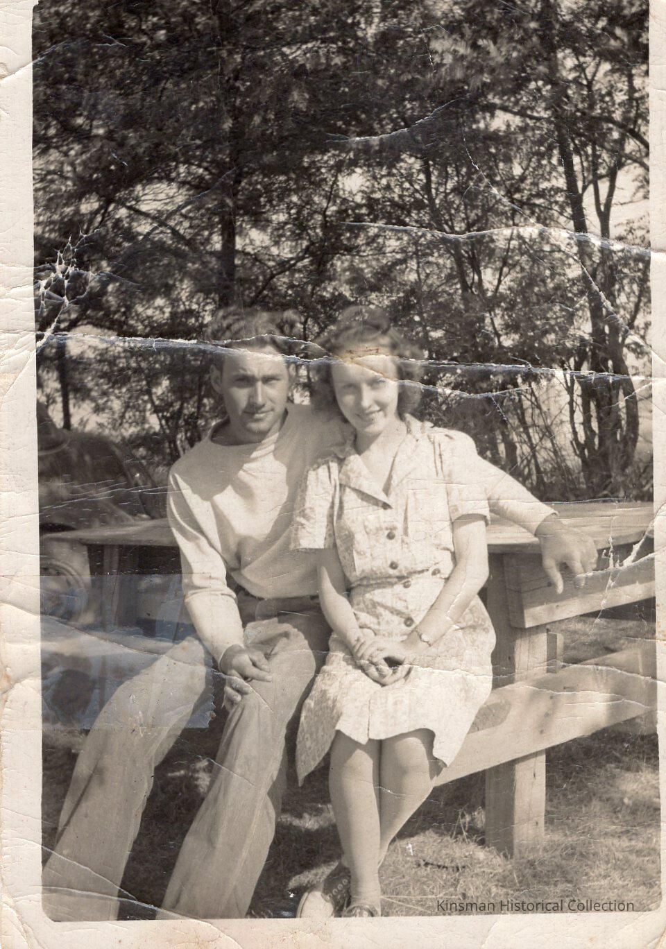 "Chas & Ruth Marvin" seated at a picnic table. Identified as "Charles William Marvin born 2/15/21".Collection