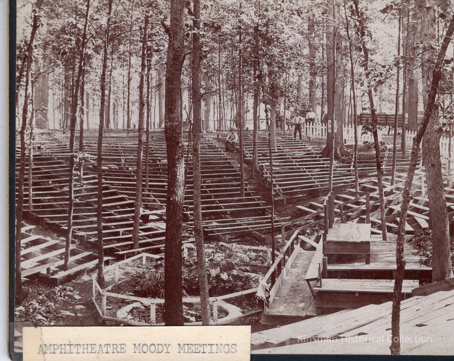 Space where they held the Moody Meetings. Rows of wood plank seating in the amphitheater facing a stage. Group of men in the background.Collection