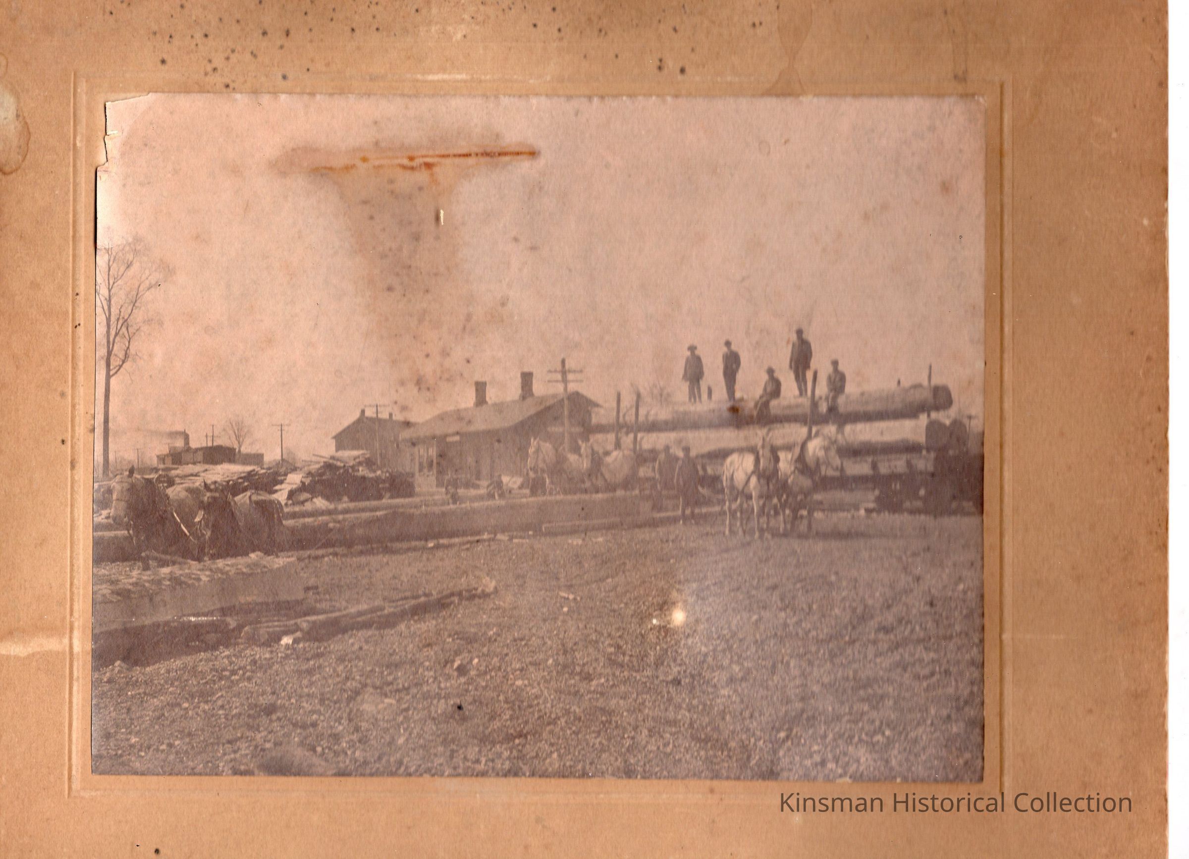 Three teams of horses and ten men take a break for this picture at the Farmdale train station. These massive logs of virgin timber from the area were sent East to be used in shipbuilding.Collection