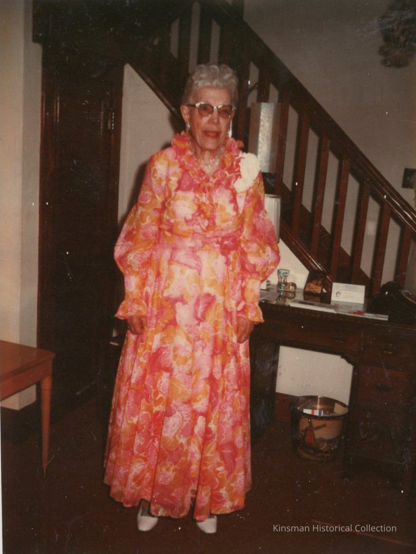 Elsie Milne standing in front of staircase wearing a vibrant floral dress.Collection