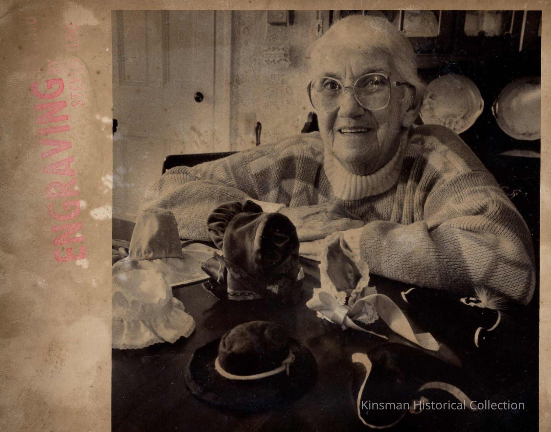 Pearl Davis seated behind a table with tiny hats taken on 3/2/1989. Stamped "Tribune Photo by Steven lko".Cataloged By