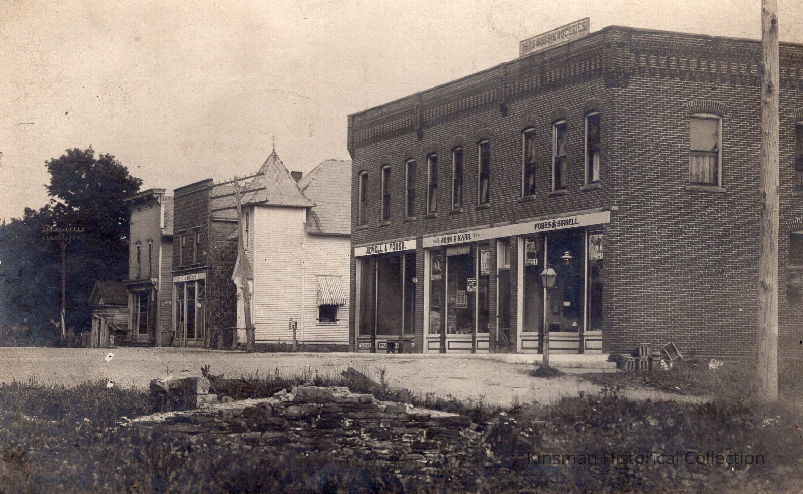 South side of Kinsman Square in 1908 with businesses Jewell & Fobes, John P. Karr, and Fobes & Birrell. At the far left are the J. K. Allen family horses Flip and Gip wearing straw hats.Collection