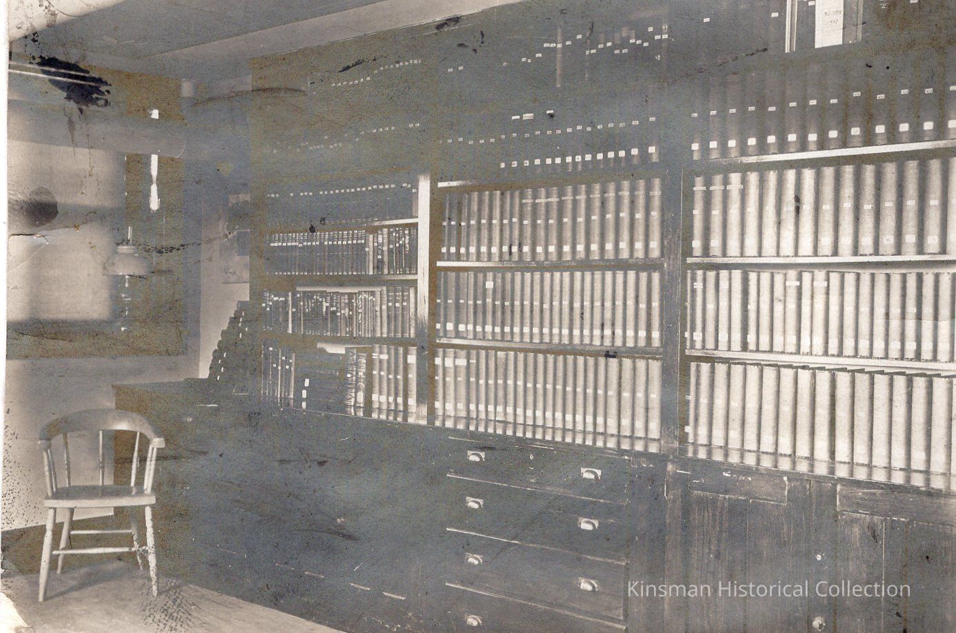 Bookshelf filled with books described in [2022.1.247] as "Old Kinsman Library".Collection