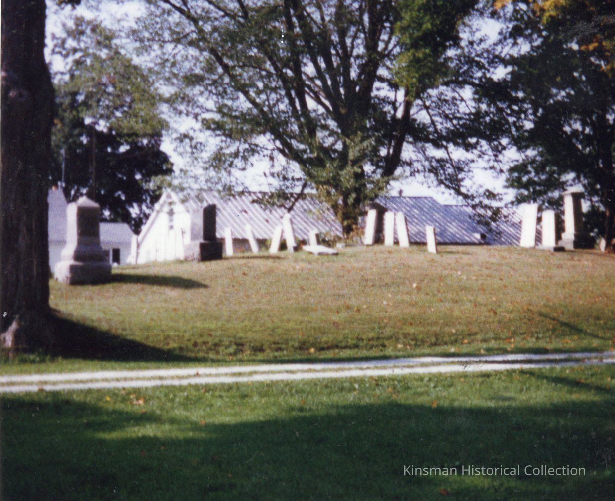 Tombstones on a hill with gravel driveway thought to be the Kinsman Cemetery.Collection