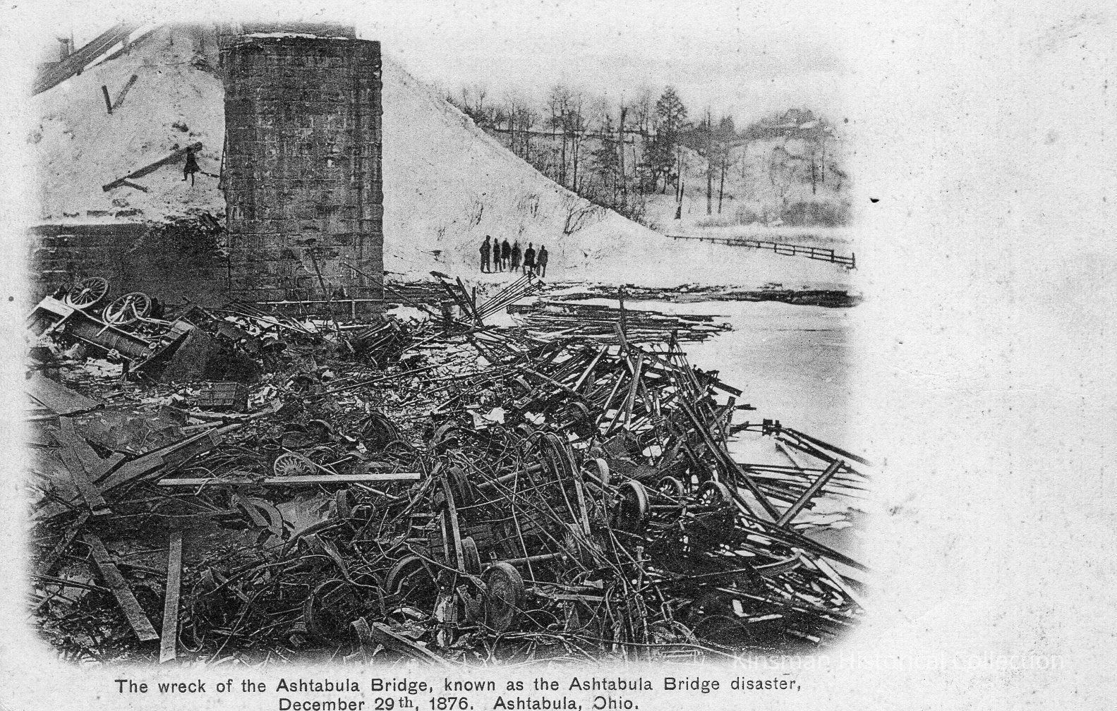 The wreck of the Ashtabula Bridge, known as the Ashtabula Bridge disaster, December 29th, 1876, Ashtabula, Ohio. Broken twisted metal in a pile beside a snowy embankment.Collection