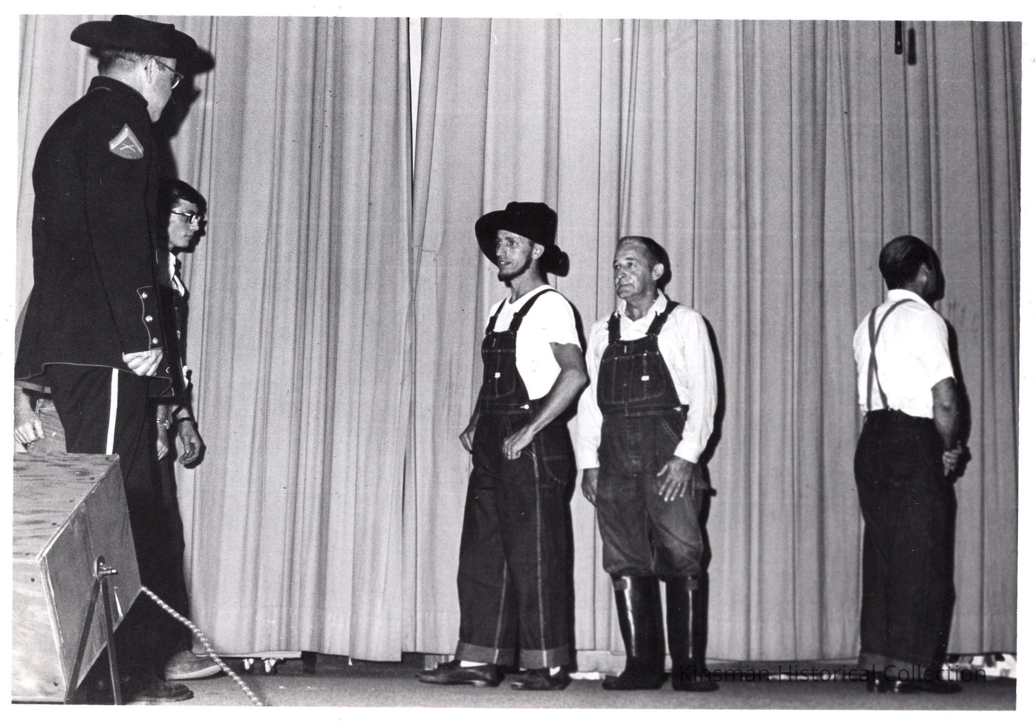 Actors in costume identified as Ralph McIntosh, one of the Holsinger twins, Gene Goss, Alfred Mathews, and Ron Jewell. Ralph McIntosh is the "Drill Master", and the rest are "Recruits" in the Kinsman Sesquicentennial Play in July 1970.Cataloged By