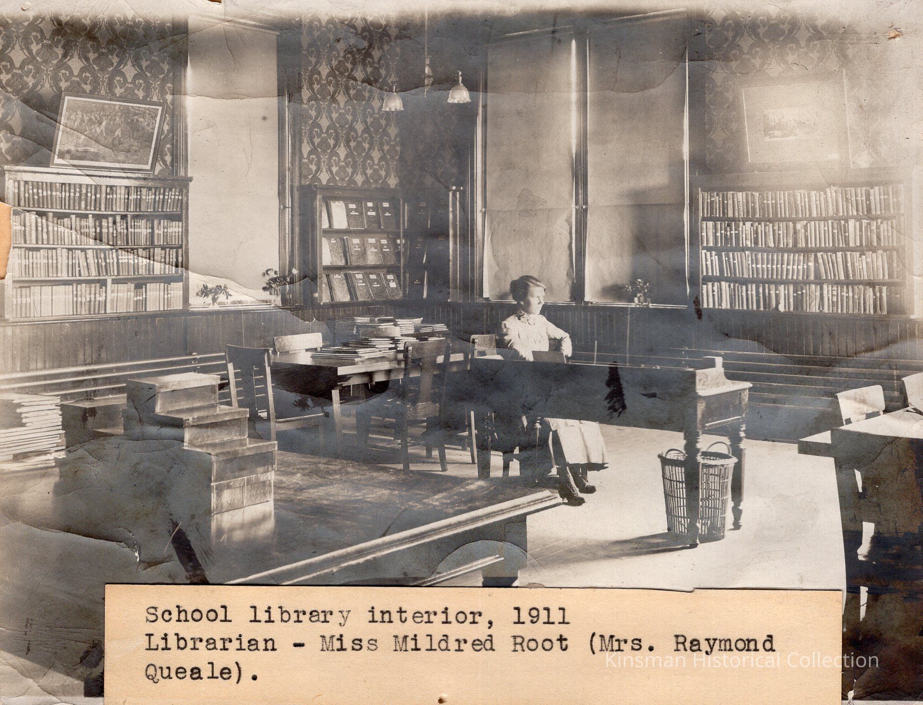 Interior of School Library in 1911 with Miss Mildred Root (Mrs. Raymond Queale) seated at a desk.Collection