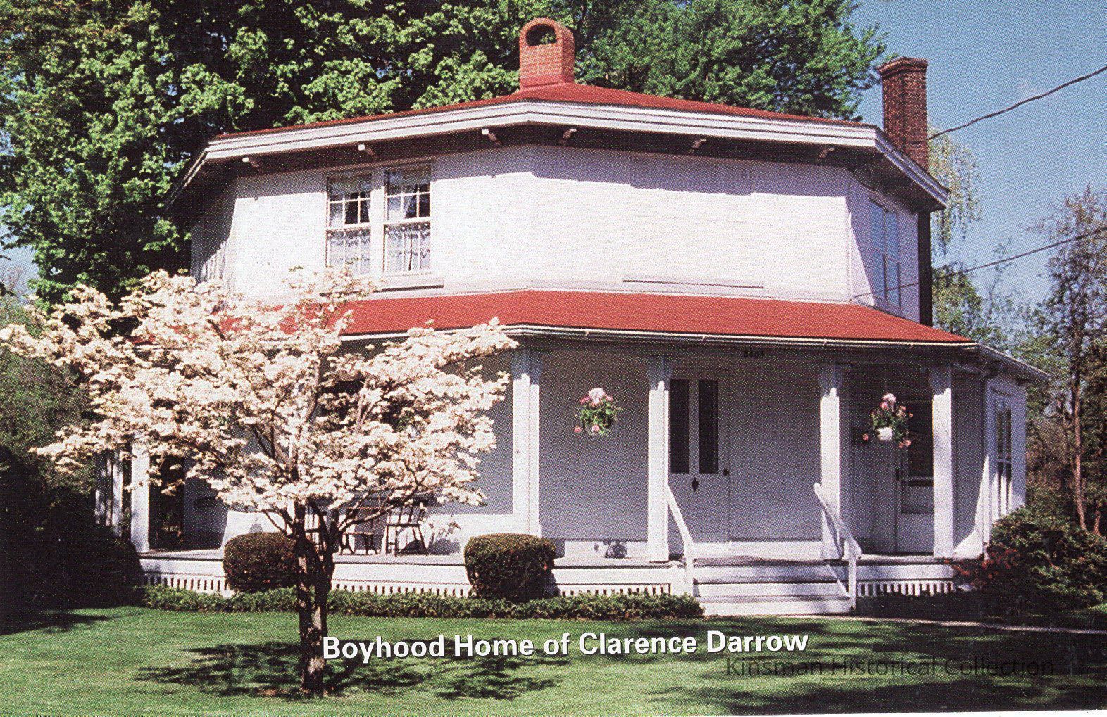 Exterior of "Boyhood Home of Clarence Darrow" with a blooming dogwood tree in the front yard. "Built in 1853- Eleanor Brown, Owner 8405 Main Street Kinsman, Ohio 44428".Cataloged By