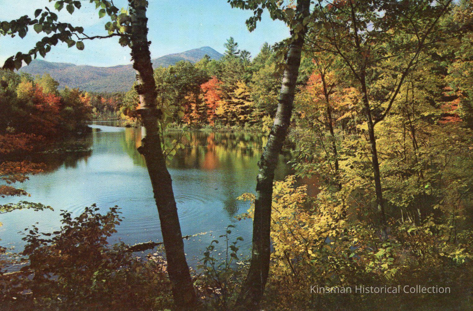 Unidentified "Quiet Cove" lake surrounded by trees with "Greetings from Kinsman, Ohio.Cataloged By