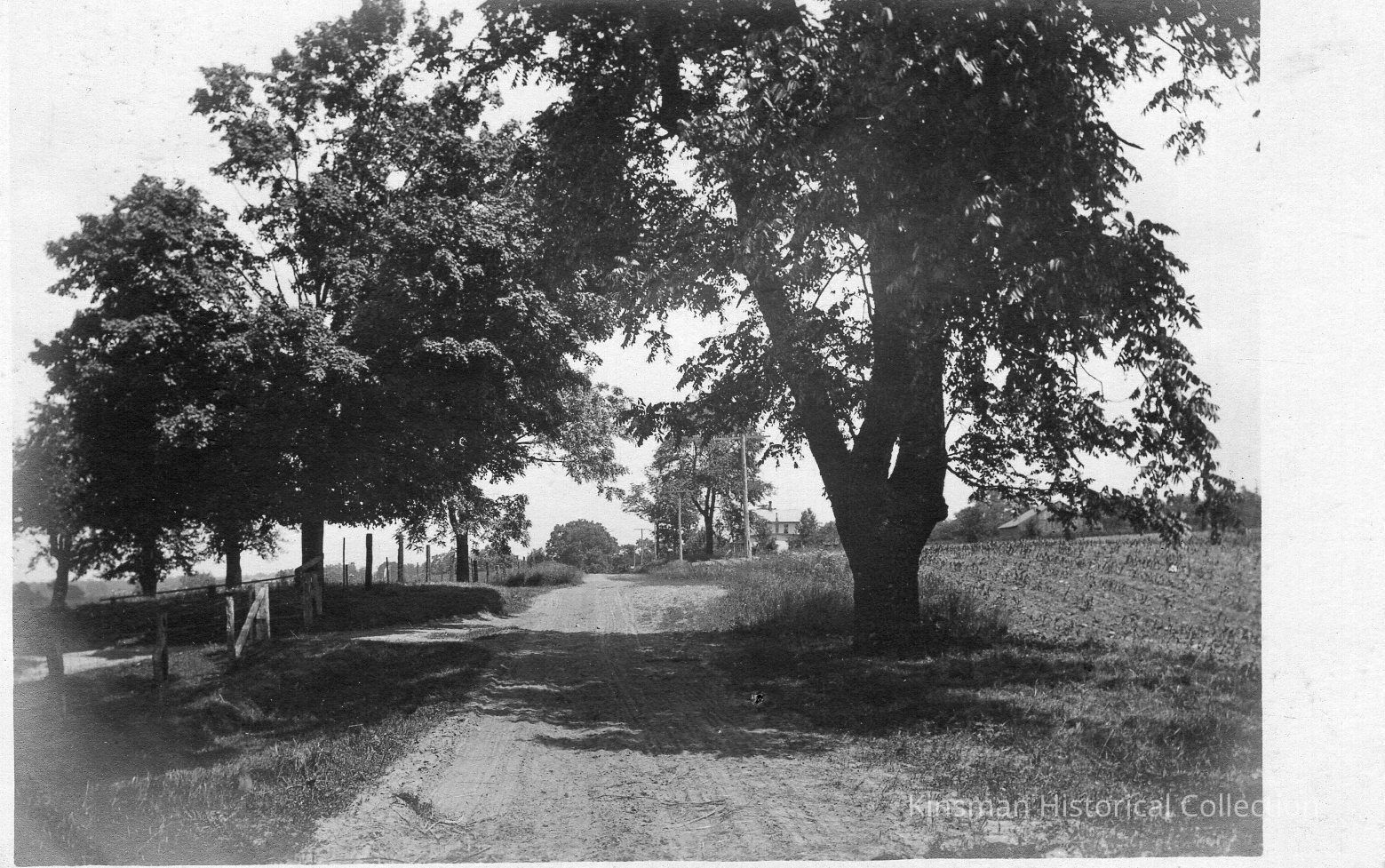 Dirt roadway with a large tree and plowed field in the background and fencing along the left side.Cataloged By