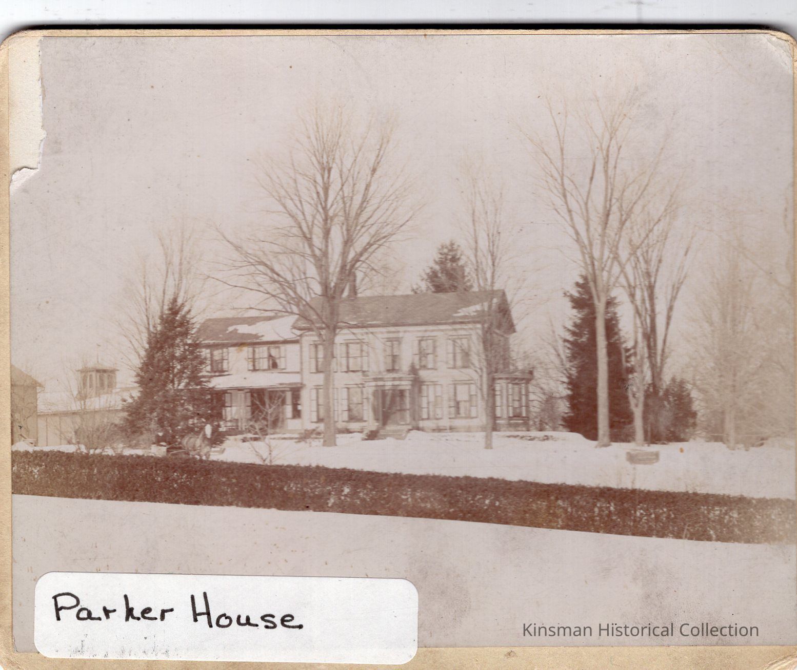 South face of snow covered Linus Parker House (Heritage Hill) with a horse drawn carriage in front circa 1830. Writing on back describes "This was Uncle Luther Boyd's. He was superintendent of schools in Kinsman, Ohio from 1890-1895; then went to law school and practiced in [unreadable] until his death in 1944. He was a younger brother of great grandma Belinda Conwell. He was born [unreadable] at Tippecanoe, Harrison Co., Ohio in a 2 story log cabin."Cataloged By