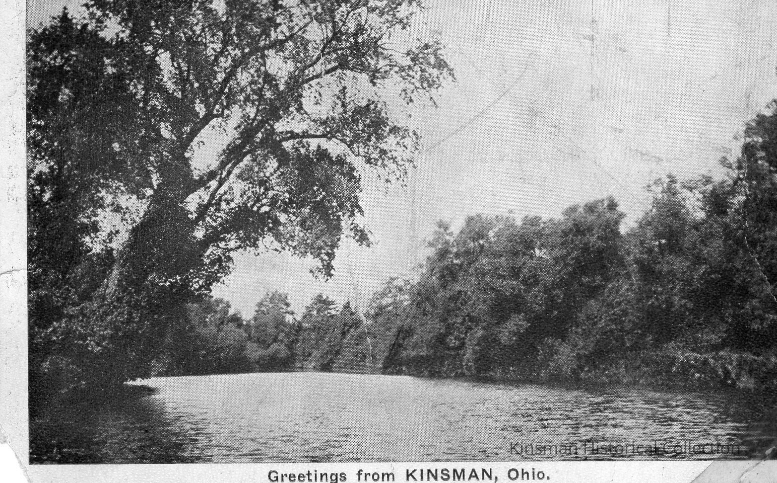 Tree lined lake in Kinsman with the message "Greeting from Kinsman, Ohio".Cataloged By