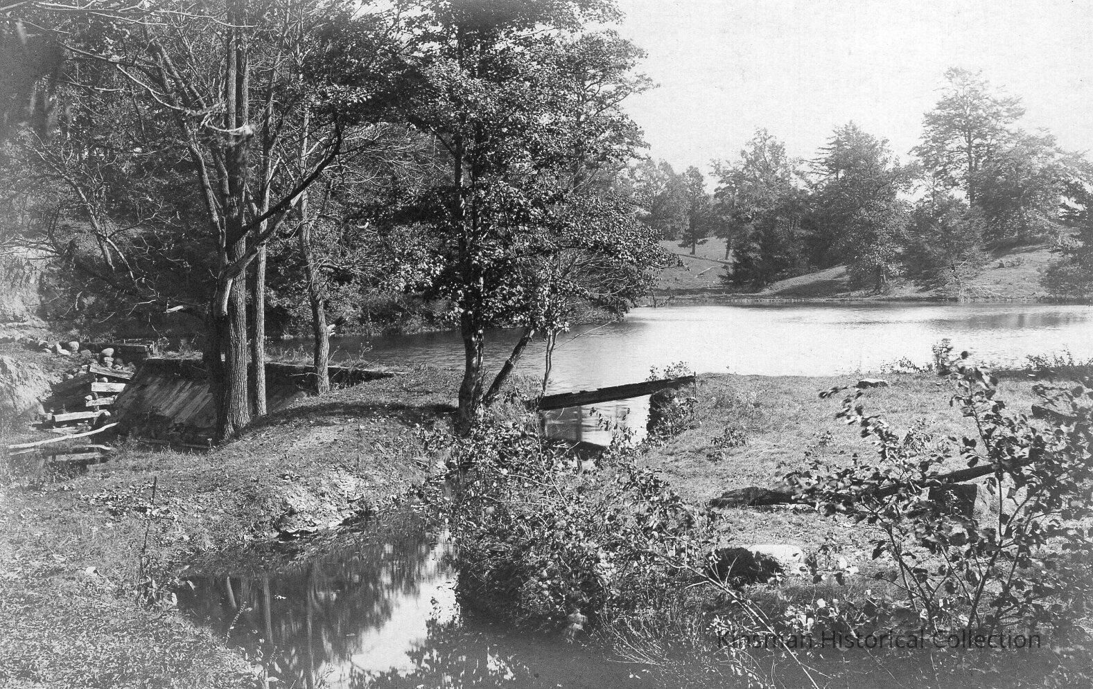 Pond described as "old water power site that furnishes power for a new lighting plant, showing where race leaves the pond (Hamilton's Pond)" in Kinsman, Ohio.Cataloged By