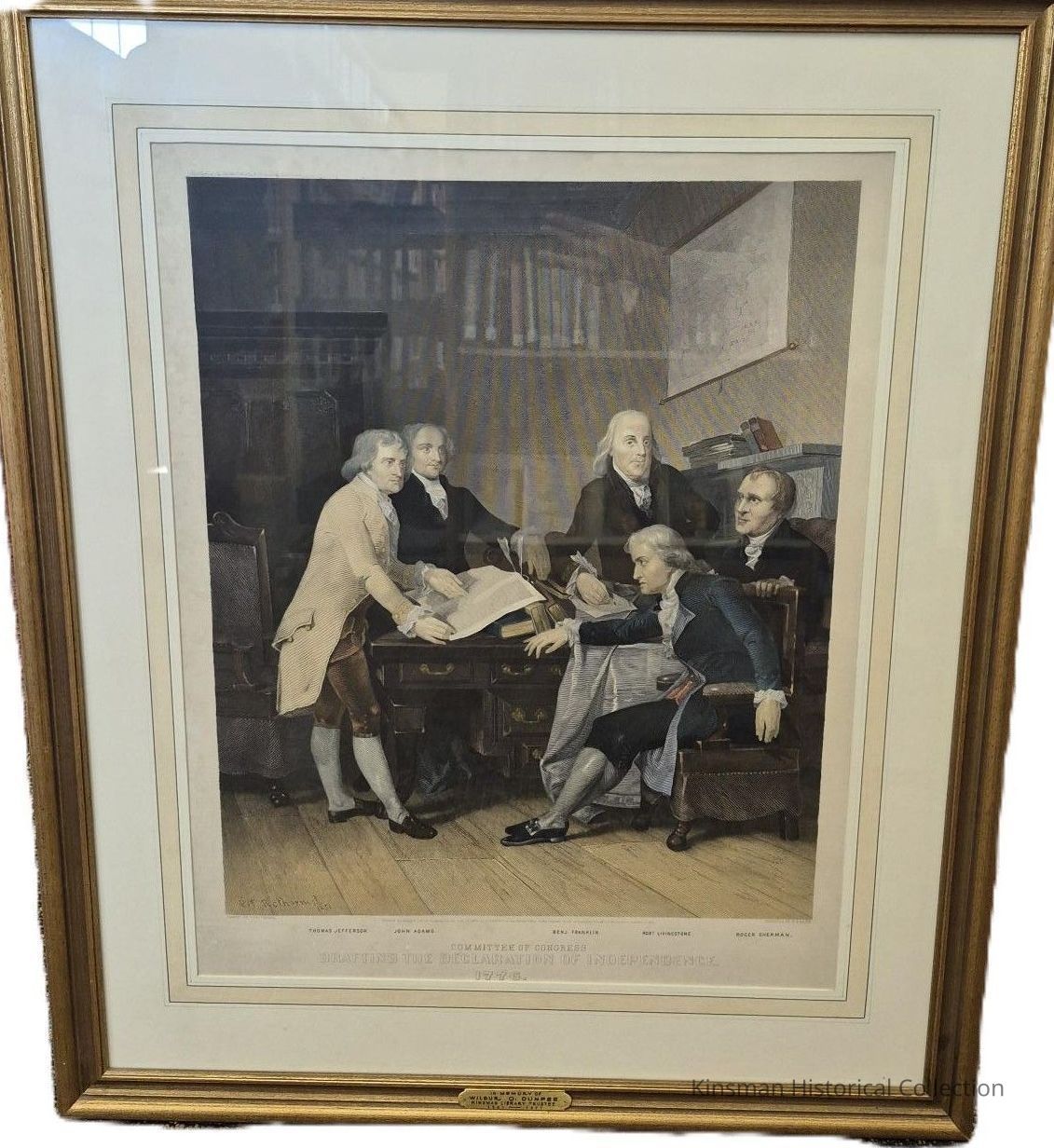 Drafting the Declaration of Independance 1776 original color engraving by T. D. Booth after the painting by P. F. Rothermel. Published in 1865. In memory of Wilbur O. Dunfee Kinsman Library Trustee 1961-1971.Cataloged By