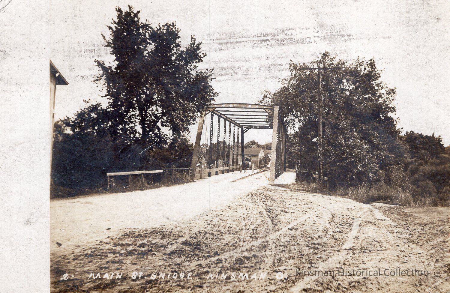 Muddy road leading up to the metal Main Street Bridge with a horse drawn buggy crossing, from 1915. Route 5 and 7 bridge on south side of Kinsman Square, old feed mill to the north, now doctors office. Taken down in the 50s. Writing on back.Cataloged By
