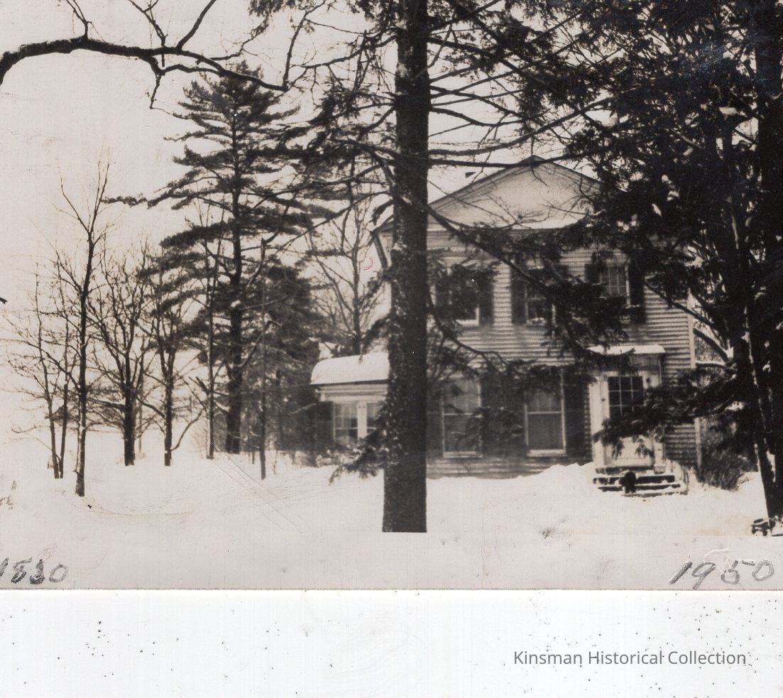 White house with black shutters and a snowy landscape.Cataloged By