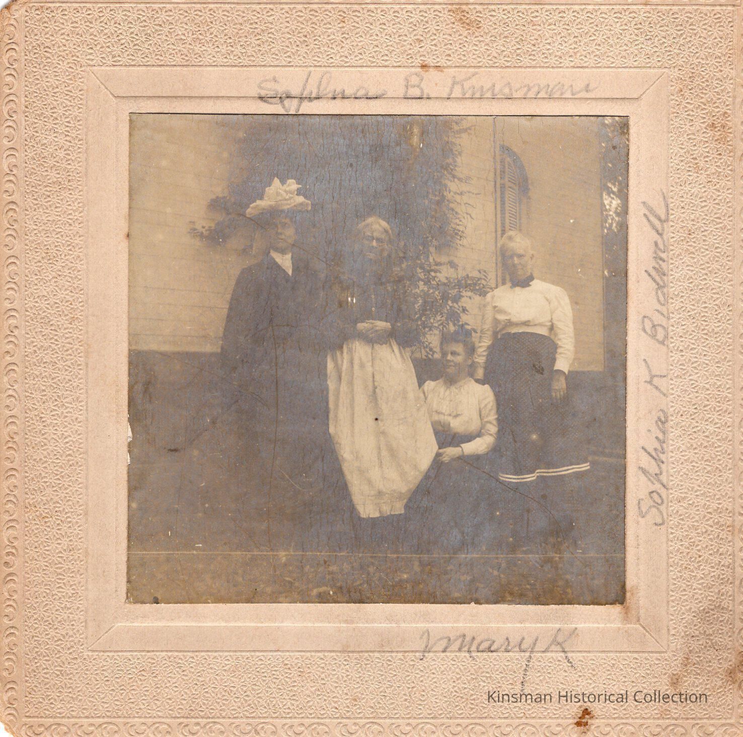 Four women standing outside the Thomas Kinsman Sr. home identified from left to right as his daughter Cornelia, wife Sophia, daughter Mary and daughter Sophia B. This is possibly from the 1880s before Cornelia's death in 1886.Collection