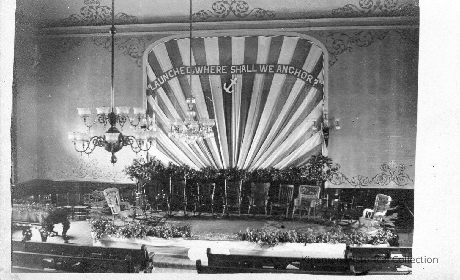 Interior of a church with pews and a stage decorated with the saying "Launched, Where Shall We Anchor?".Cataloged By