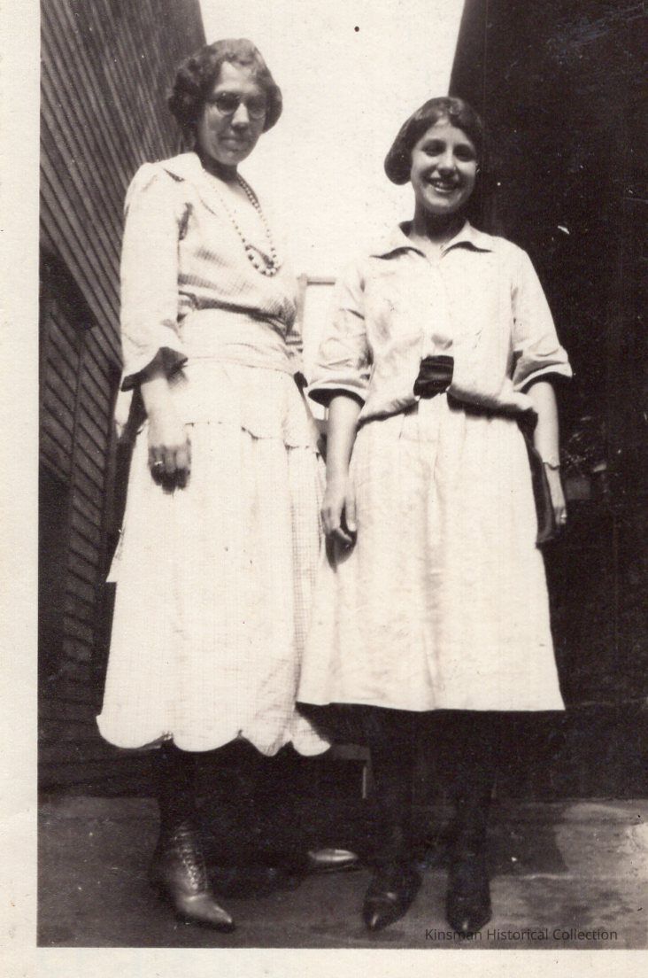 Elsie Milne on left with unidentified woman standing between two buildings.Collection