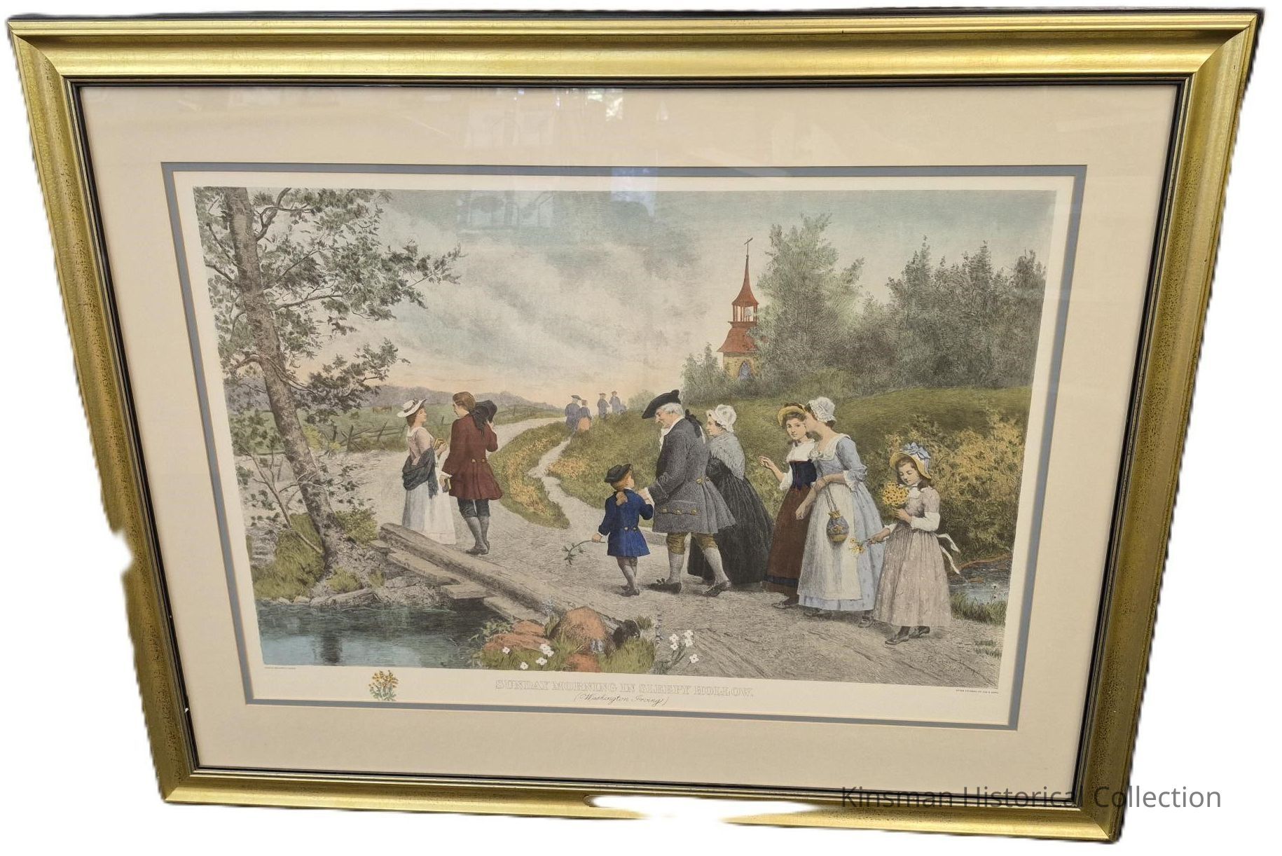 Handcolored engraving of Sunday Morning in Sleepy Hollow by Jennie Augusta Brownscombe in memory of Harry Marsh.Cataloged By