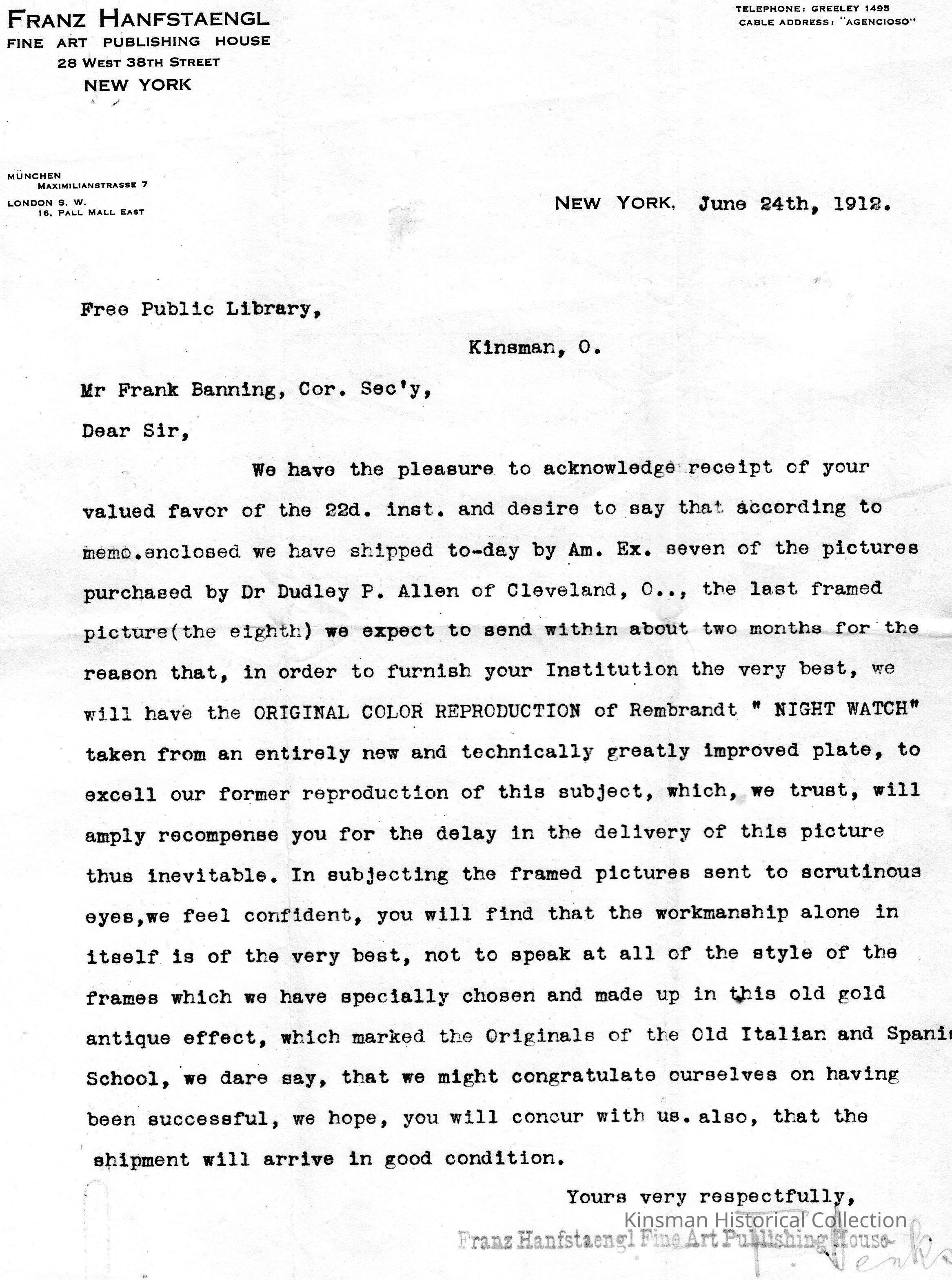 Letter written to Frank Banning of Kinsman Ohio from Franz Hanfstaengl Fine Art Publishing House of New York from June 24, 1912. Letter outlines the shipment of fine art by Dr. Dudley P. Allen to furnish the Kinsman Free Public Library including an inventory sheet.