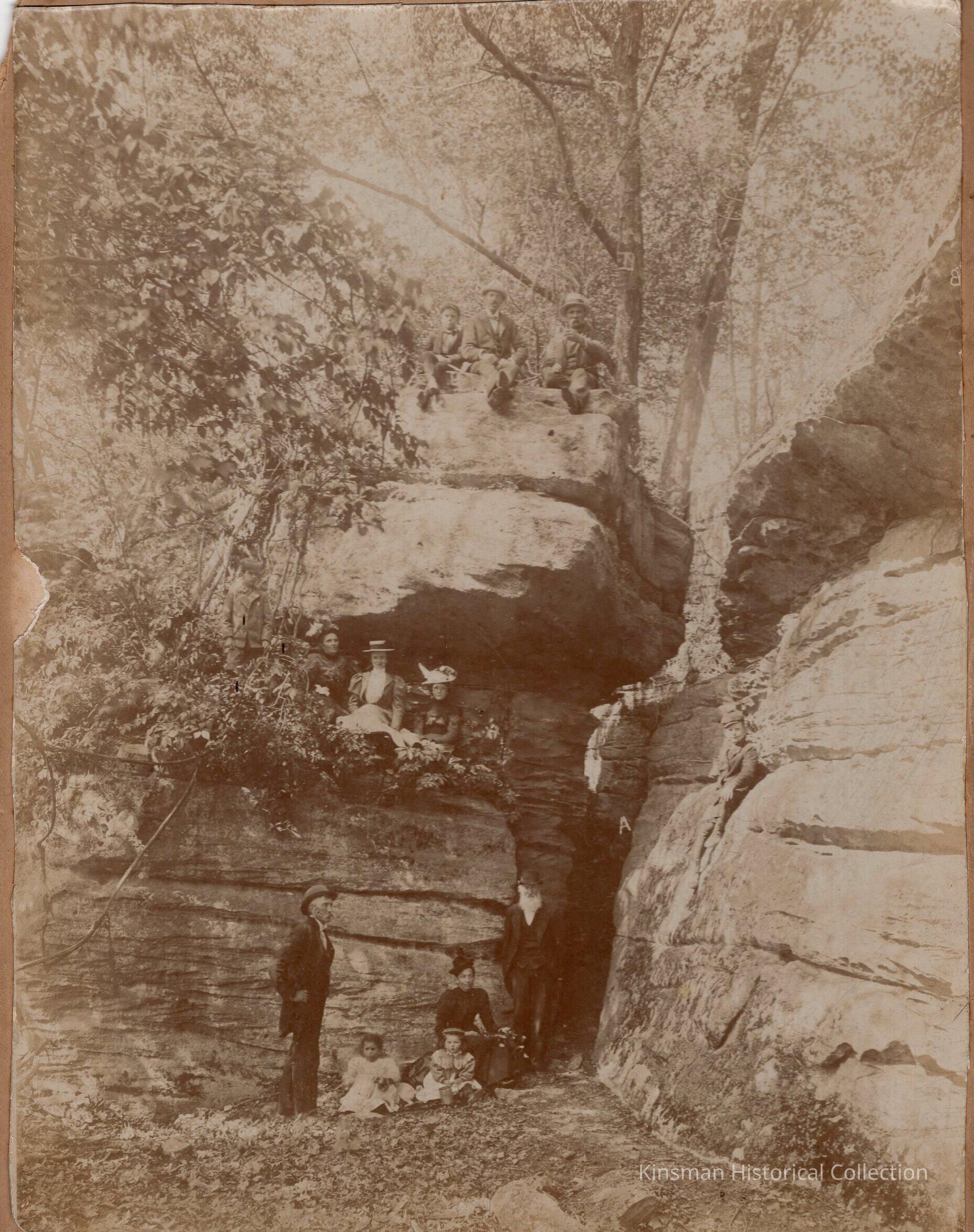 Group of Kinsman and Farmdale residents on an outing to Hartford Ledges circ 1880. Members identified 1st level Dewiltt Tower Root, Mildred Root with pug Scraps, Lucy Allen and daughter Ruth Allen, and Mr. Burnett.