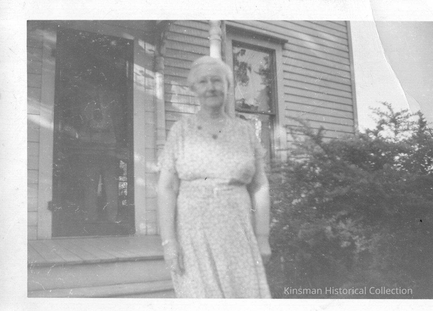 Portrait of a woman in front of porch with man in doorway. Writing on back "June 1950".Collection