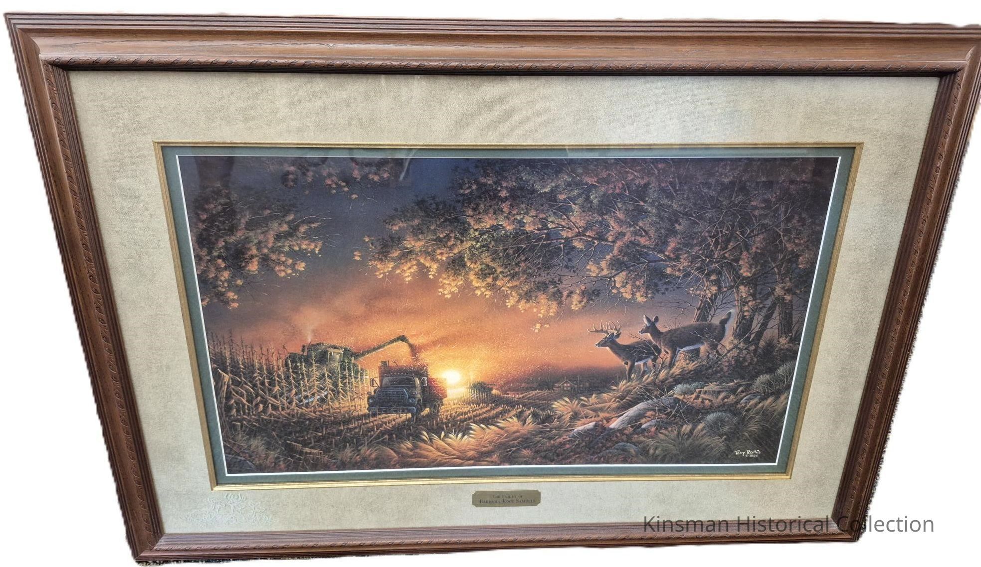 Farm scene with deer at sunset titled Sunset Harvest by Terry Redlin 1998. Presented by the family of Barbara Root Samuels.Cataloged By