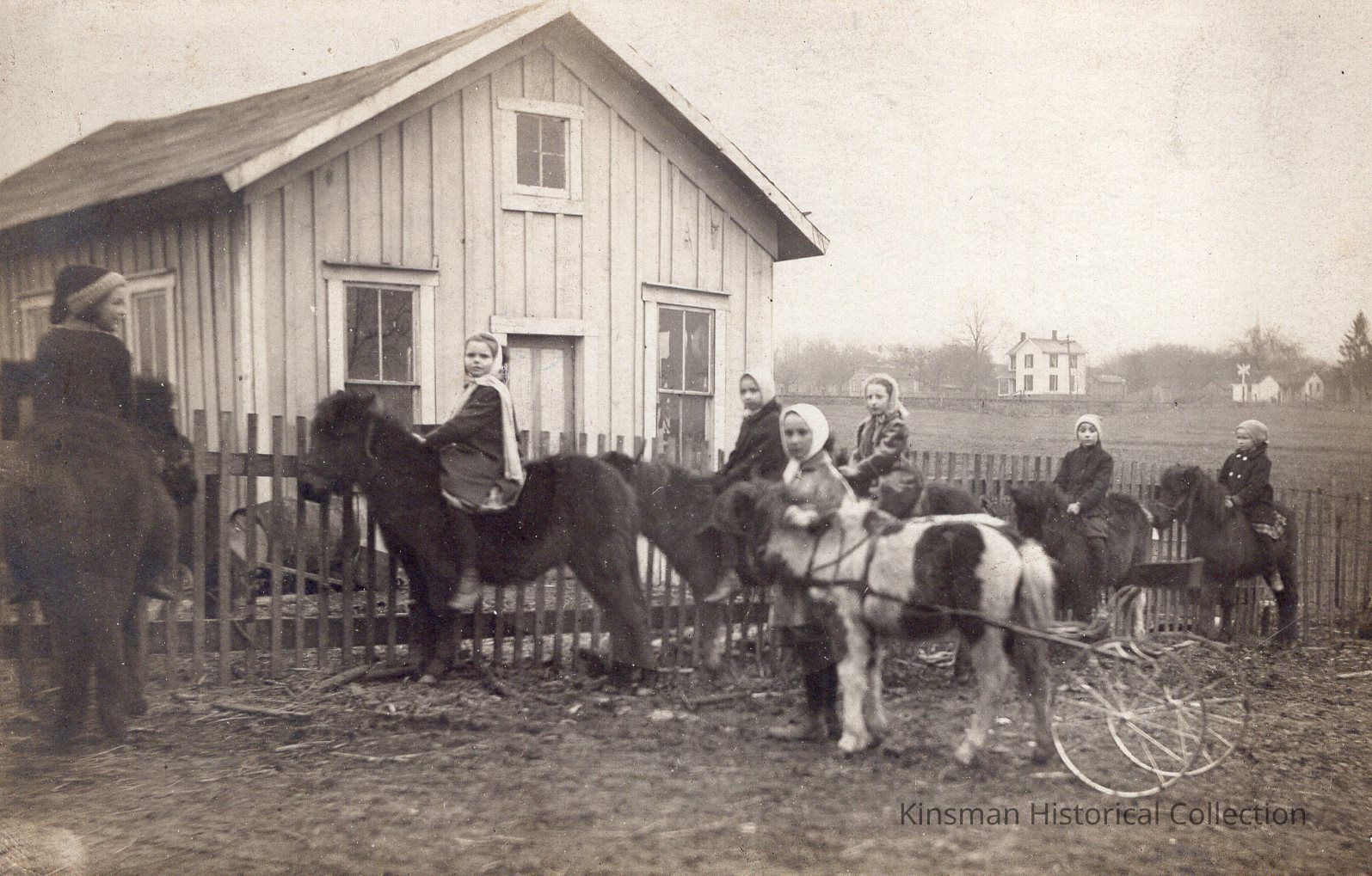 Group of young children seated on ponies in front of a fence in the early 1900s. Children identified from left to right as Cornelia Anderson, Margaret Walker, Nellie Dowd, Mabel Lister, Herbert Hadley, Jeanette Parsons, and Carrie Bell Parsons.Cataloged By