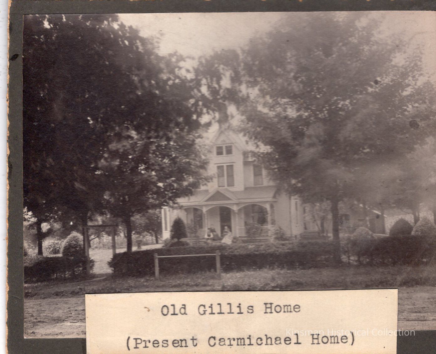 Group of unidentified people sitting on the front steps of the "Old Gillis Home" taken from across the road. The David Sylvester and Sarah Wood Gillis House, located on State Street. Their son Frank became a noted singer in the Boston area, and their daughter Mabel married Andrew Birrell.Cataloged By