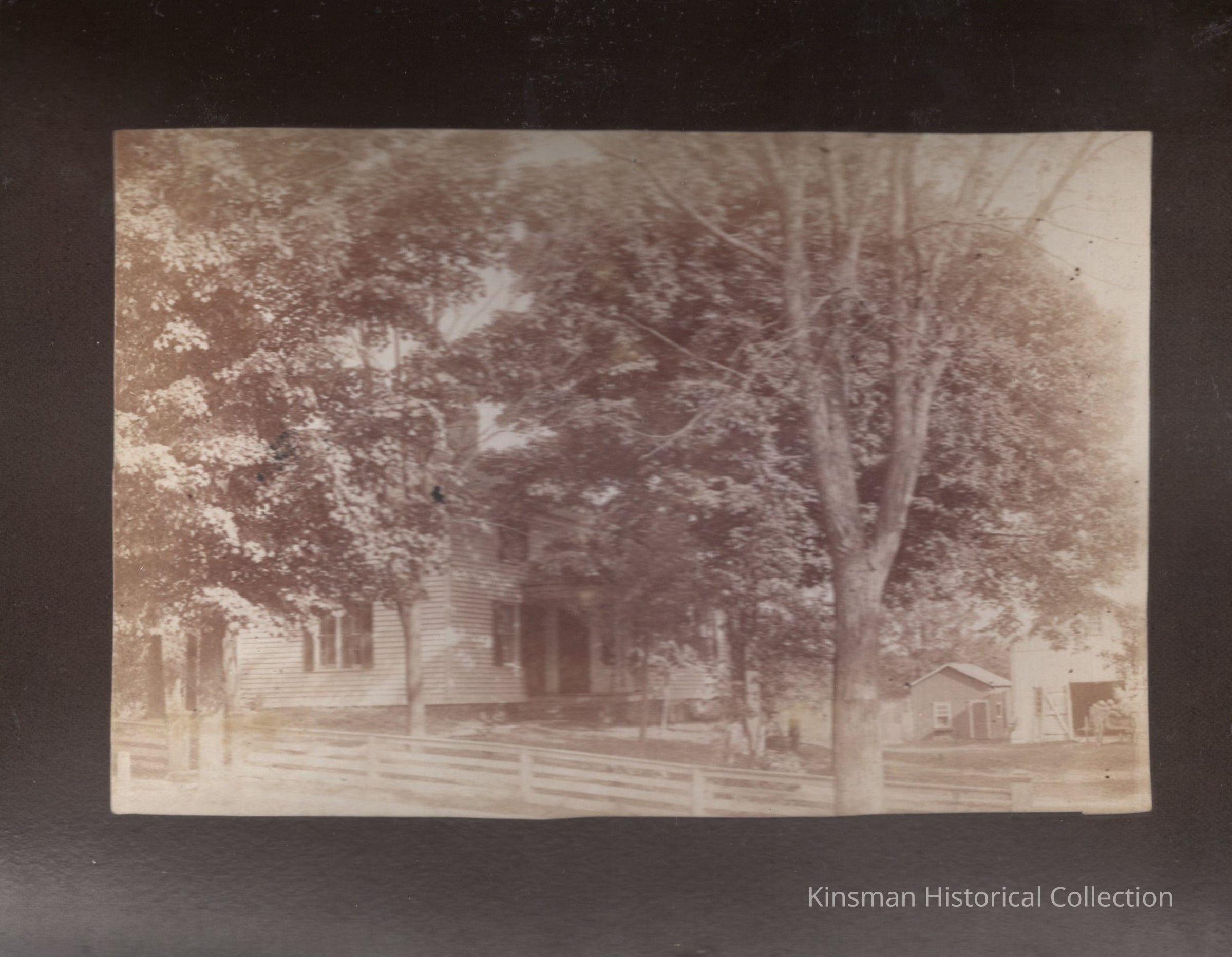 Tree shaded house with nearby barn identified as H. J. Robins residence 1891.Cataloged By